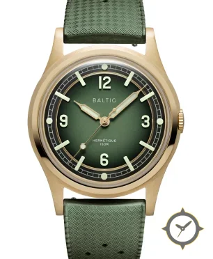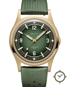 Eine Taucheruhr-Uhr mit einem 36mm Gehäuse im Vintage-Stil gefertigt aus Bronze mit einem Zifferblatt in grün und einer besonderen "sunburst"-Oberfläche.