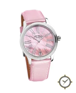 Eine Dress-Uhr mit einem 33mm Gehäuse im Vintage-Stil gefertigt aus Edelstahl mit einem Zifferblatt in weiß und einer besonderen "mother-of-pearl"-Oberfläche.