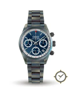 Eine Chronograph-Uhr mit einem vielseitigen 40.5mm Gehäuse, das an fast jedes Handgelenk passt, gefertigt aus Edelstahl mit einem Zifferblatt in blau und einer besonderen "sunburst"-Oberfläche.