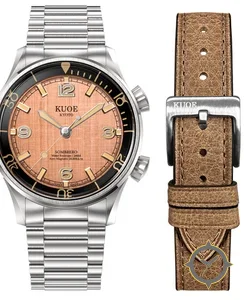 Eine Taucheruhr-Uhr mit einem vielseitigen 40.5mm Gehäuse, das an fast jedes Handgelenk passt, gefertigt aus Edelstahl mit einem Zifferblatt in gold und einer besonderen "vertical-brushed"-Oberfläche.
