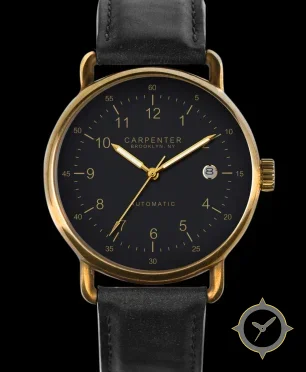Eine Dress-Uhr mit einem 33.5mm Gehäuse im Vintage-Stil gefertigt aus Messing mit einem Zifferblatt in schwarz und einer besonderen "matte/smooth"-Oberfläche.
