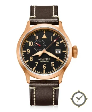 Eine Pilot-Uhr mit einem 37.5mm Gehäuse im Vintage-Stil gefertigt aus Bronze mit einem Zifferblatt in schwarz und einer besonderen "grained"-Oberfläche.