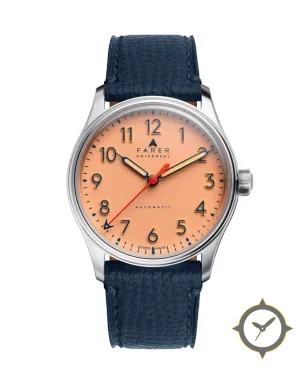 Eine Field-Uhr mit einem 35mm Gehäuse im Vintage-Stil gefertigt aus Edelstahl mit einem Zifferblatt in orange und einer besonderen "matte"-Oberfläche.