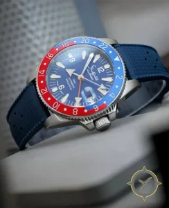 Eine GMT-Uhr mit einem markanten 43mm Auftritt am Handgelenk, gefertigt aus Edelstahl mit einem Zifferblatt in blau und einer besonderen "sunburst"-Oberfläche und einer echten GMT-Funktion, mit der du eine zweite Zeitzone verfolgen kannst.