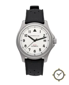Eine Field-Uhr mit einem 37.5mm Gehäuse im Vintage-Stil gefertigt aus Edelstahl mit einem Zifferblatt in weiß und einer besonderen "matte"-Oberfläche.