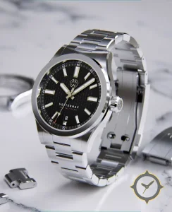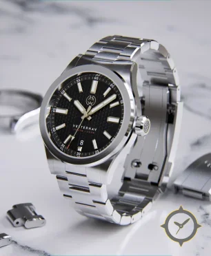 Eine Sport-Uhr mit einem 33mm Gehäuse im Vintage-Stil gefertigt aus Edelstahl mit einem Zifferblatt in schwarz und einer besonderen "textured triangular/waffle pattern (raised repeating triangles)"-Oberfläche.