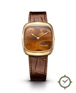 Eine Dress-Uhr mit einem 33.5mm Gehäuse im Vintage-Stil gefertigt aus Gold mit einem Zifferblatt in braun und einer besonderen "tiger-eye / wood grain finish"-Oberfläche.