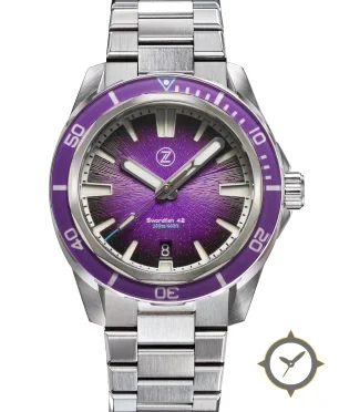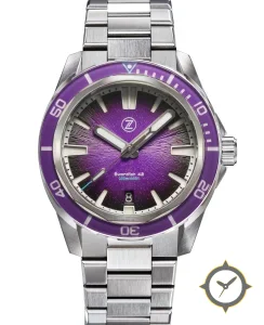 Eine Taucheruhr-Uhr mit einem vielseitigen 40mm Gehäuse, das an fast jedes Handgelenk passt, gefertigt aus Edelstahl mit einem Zifferblatt in lila und einer besonderen "textured sunburst / radial graining"-Oberfläche.