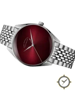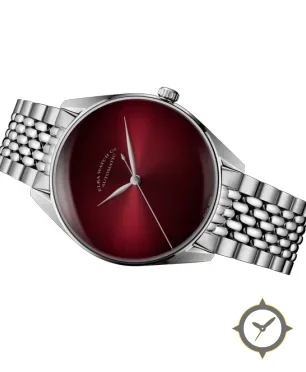 Eine Dress-Uhr mit einem markanten 42mm Auftritt am Handgelenk, gefertigt aus Edelstahl mit einem Zifferblatt in karmesinrot und einer besonderen "sunburst gradient (fumé)"-Oberfläche.