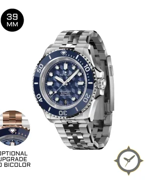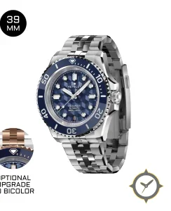 Eine Taucheruhr-Uhr mit einem 33mm Gehäuse im Vintage-Stil gefertigt aus Edelstahl mit einem Zifferblatt in blau und einer besonderen "3D hexagonal / guilloché texture"-Oberfläche.