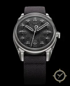 Eine Minimalistisch-Uhr mit einem 32.5mm Gehäuse im Vintage-Stil gefertigt aus Titan mit einem Zifferblatt in schwarz und einer besonderen "three-dimensional raised bead/pin grid texture"-Oberfläche.