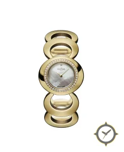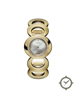 Eine Luxus-Uhr mit einem markanten 42.5mm Auftritt am Handgelenk, gefertigt aus Gold mit einem Zifferblatt in weiß und einer besonderen "mother-of-pearl"-Oberfläche.