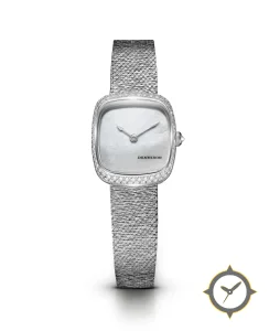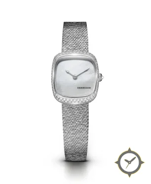 Eine Dress-Uhr mit einem 31mm Gehäuse im Vintage-Stil gefertigt aus Edelstahl mit einem Zifferblatt in weiß und einer besonderen "mother-of-pearl"-Oberfläche.