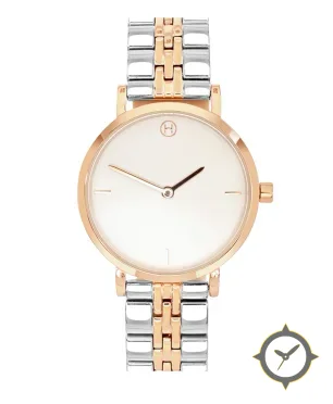 Eine GMT-Uhr mit einem 25mm Gehäuse im Vintage-Stil gefertigt aus Gold mit einem Zifferblatt in weiß und einer besonderen "smooth lacquer"-Oberfläche und einer echten GMT-Funktion, mit der du eine zweite Zeitzone verfolgen kannst.