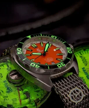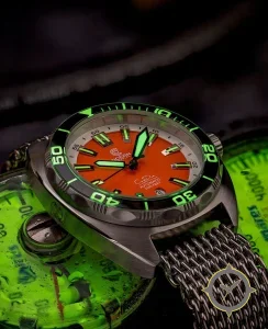 Eine Taucheruhr-Uhr mit einem 37.5mm Gehäuse im Vintage-Stil gefertigt aus Edelstahl mit einem Zifferblatt in orange und einer besonderen "matte lacquer"-Oberfläche.