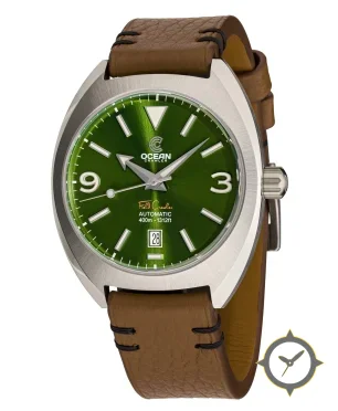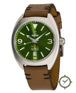 Eine Taucheruhr-Uhr gefertigt aus Edelstahl mit einem Zifferblatt in grün und einer besonderen "sunburst"-Oberfläche.