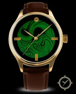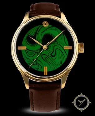 Eine Dress-Uhr mit einem 37mm Gehäuse im Vintage-Stil gefertigt aus Gold mit einem Zifferblatt in grün und einer besonderen "marbled swirl"-Oberfläche.