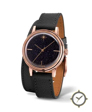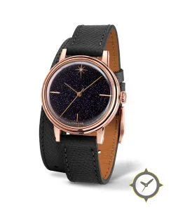 Eine Dress-Uhr mit einem 34mm Gehäuse im Vintage-Stil gefertigt aus Gold mit einem Zifferblatt in marineblau und einer besonderen "aventurine / sparkling (starfield)"-Oberfläche.
