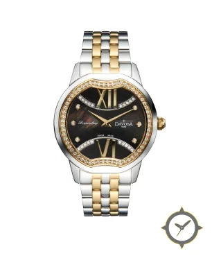 Eine Dress-Uhr mit einem markanten 41.5mm Auftritt am Handgelenk, gefertigt aus Edelstahl mit einem Zifferblatt in schwarz und einer besonderen "mother-of-pearl (iridescent)"-Oberfläche.
