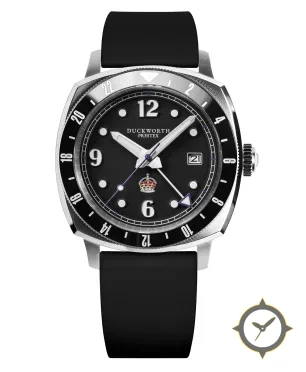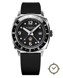 Eine GMT-Uhr mit einem 37mm Gehäuse im Vintage-Stil gefertigt aus Edelstahl mit einem Zifferblatt in schwarz und einer besonderen "matte"-Oberfläche und einer echten GMT-Funktion, mit der du eine zweite Zeitzone verfolgen kannst.