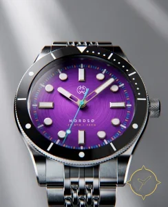 Eine Taucheruhr-Uhr mit einem 37.5mm Gehäuse im Vintage-Stil gefertigt aus Edelstahl mit einem Zifferblatt in lila und einer besonderen "sunburst"-Oberfläche.
