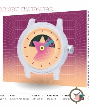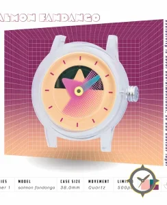 Eine Minimalistisch-Uhr mit einem vielseitigen 38.5mm Gehäuse, das an fast jedes Handgelenk passt, gefertigt aus Harz mit einem Zifferblatt in orange und einer besonderen "matte plastic"-Oberfläche.