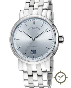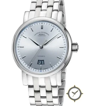 Eine Dress-Uhr mit einem markanten 42mm Auftritt am Handgelenk, gefertigt aus Edelstahl mit einem Zifferblatt in silber und einer besonderen "sunburst (radial brushed)"-Oberfläche.