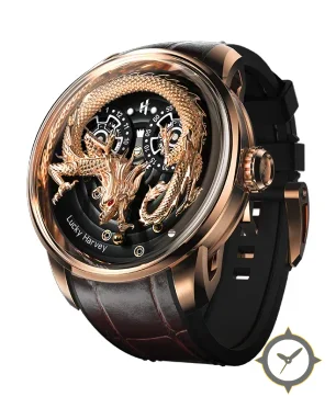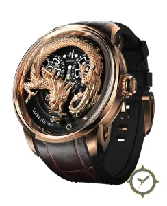 Eine Luxus-Uhr mit einem vielseitigen 40mm Gehäuse, das an fast jedes Handgelenk passt, gefertigt aus Gold mit einem Zifferblatt in schwarz und einer besonderen "3D sculpted relief with raised gold dragon"-Oberfläche.