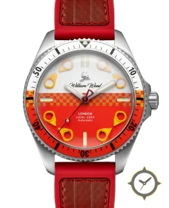 Eine Taucheruhr-Uhr mit einem vielseitigen 38mm Gehäuse, das an fast jedes Handgelenk passt, gefertigt aus Edelstahl mit einem Zifferblatt in rot und einer besonderen "glossy with applied markers"-Oberfläche.