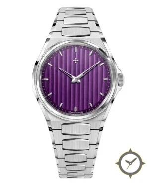 Eine Luxus-Uhr mit einem 37mm Gehäuse im Vintage-Stil gefertigt aus Edelstahl mit einem Zifferblatt in lila und einer besonderen "vertical fluted (ribbed)"-Oberfläche.
