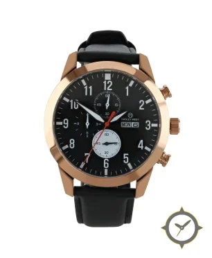 Eine Chronograph-Uhr mit einem markanten 49mm Auftritt am Handgelenk, gefertigt aus Gold mit einem Zifferblatt in schwarz und einer besonderen "matte"-Oberfläche.
