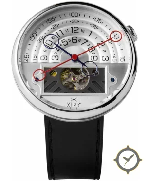 Eine Skelett-Uhr mit einem markanten 48.5mm Auftritt am Handgelenk, gefertigt aus Edelstahl mit einem Zifferblatt in silber und einer besonderen "brushed concentric rings"-Oberfläche.