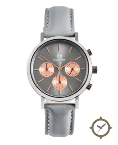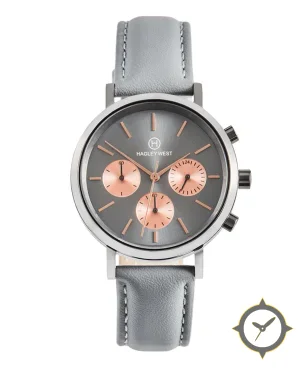Eine Chronograph-Uhr mit einem 32.5mm Gehäuse im Vintage-Stil gefertigt aus Edelstahl mit einem Zifferblatt in grau und einer besonderen "sunburst"-Oberfläche.