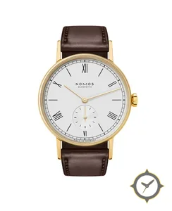 Eine Dress-Uhr mit einem 36.5mm Gehäuse im Vintage-Stil gefertigt aus Gold mit einem Zifferblatt in weiß und einer besonderen "lacquer"-Oberfläche.