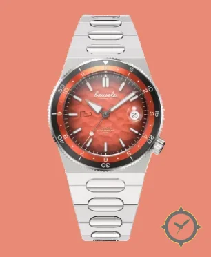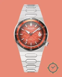 Eine Taucheruhr-Uhr mit einem vielseitigen 39.5mm Gehäuse, das an fast jedes Handgelenk passt, gefertigt aus Edelstahl mit einem Zifferblatt in orange und einer besonderen "marbled/sunburst"-Oberfläche.