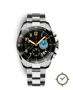 Eine Chronograph-Uhr mit einem vielseitigen 39.5mm Gehäuse, das an fast jedes Handgelenk passt, gefertigt aus Edelstahl mit einem Zifferblatt in schwarz und einer besonderen "matte"-Oberfläche.