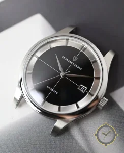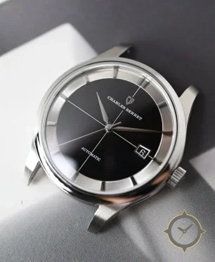 Eine Dress-Uhr mit einem 31.5mm Gehäuse im Vintage-Stil gefertigt aus Edelstahl mit einem Zifferblatt in schwarz und einer besonderen "glossy/sunburst center with fluted recessed chapter ring"-Oberfläche.