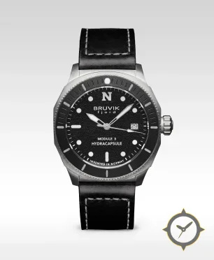 Eine Taucheruhr-Uhr mit einem markanten 46.5mm Auftritt am Handgelenk, gefertigt aus Edelstahl mit einem Zifferblatt in schwarz und einer besonderen "grained/textured"-Oberfläche.