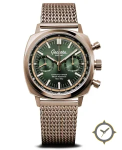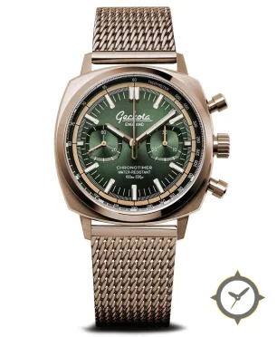 Eine Chronograph-Uhr mit einem vielseitigen 41mm Gehäuse, das an fast jedes Handgelenk passt, gefertigt aus Bronze mit einem Zifferblatt in grün und einer besonderen "sunburst"-Oberfläche.