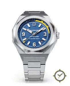 Eine Taucheruhr-Uhr gefertigt aus Edelstahl mit einem Zifferblatt in blau und einer besonderen "wave texture"-Oberfläche.