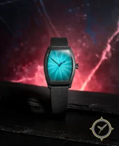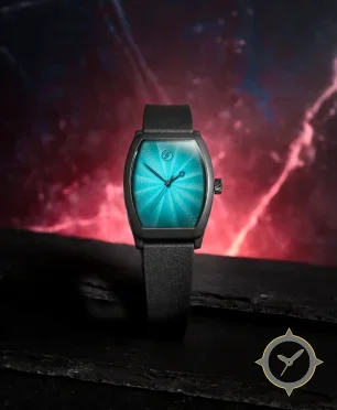 Eine Minimalistisch-Uhr mit einem 34.5mm Gehäuse im Vintage-Stil gefertigt aus Beschichtung mit einem Zifferblatt in türkis und einer besonderen "radial guilloche"-Oberfläche.