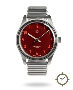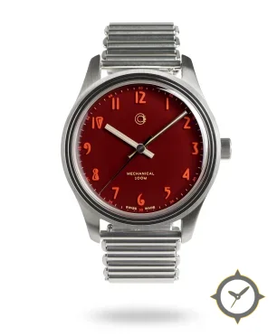 Eine Field-Uhr mit einem markanten 45.5mm Auftritt am Handgelenk, gefertigt aus Edelstahl mit einem Zifferblatt in rot und einer besonderen "matte"-Oberfläche.