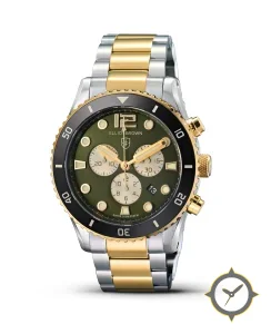 Eine Taucheruhr-Uhr gefertigt aus Edelstahl mit einem Zifferblatt in grün und einer besonderen "matte sunburst"-Oberfläche.
