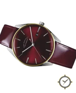 Eine Dress-Uhr mit einem markanten 48.5mm Auftritt am Handgelenk, gefertigt aus Edelstahl mit einem Zifferblatt in karmesinrot und einer besonderen "sunburst (fumé)"-Oberfläche.