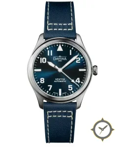 Eine Pilot-Uhr mit einem 36mm Gehäuse im Vintage-Stil gefertigt aus Edelstahl mit einem Zifferblatt in blau und einer besonderen "sunburst (radial)"-Oberfläche.