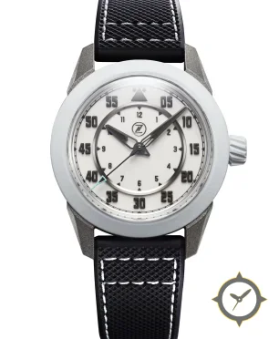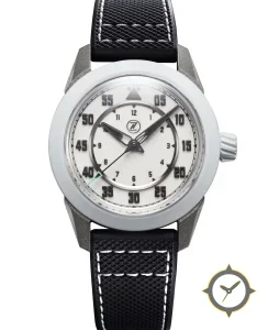 Eine Pilot-Uhr mit einem markanten 44.5mm Auftritt am Handgelenk, gefertigt aus Edelstahl mit einem Zifferblatt in weiß und einer besonderen "matte"-Oberfläche.