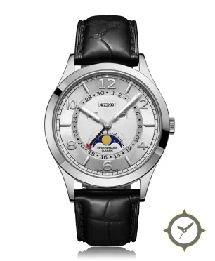 Eine Dress-Uhr mit einem 34.5mm Gehäuse im Vintage-Stil gefertigt aus Edelstahl mit einem Zifferblatt in silber und einer besonderen "sunburst/brushed finish with concentric levels"-Oberfläche und einer wunderschönen Mondphasenanzeige.