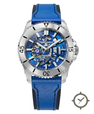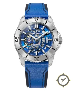 Eine Taucheruhr-Uhr mit einem markanten 43mm Auftritt am Handgelenk, gefertigt aus Edelstahl mit einem Zifferblatt in blau und einer besonderen "skeleton/openworked"-Oberfläche.