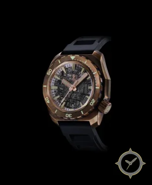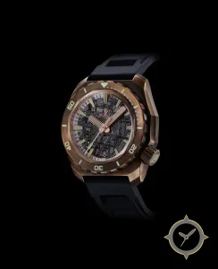 Eine Taucheruhr-Uhr mit einem markanten 49.5mm Auftritt am Handgelenk, gefertigt aus Bronze mit einem Zifferblatt in schwarz und einer besonderen "meteorite"-Oberfläche.