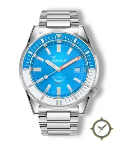 Eine Taucheruhr-Uhr mit einem markanten 51.5mm Auftritt am Handgelenk, gefertigt aus Edelstahl mit einem Zifferblatt in blau und einer besonderen "sunburst"-Oberfläche.